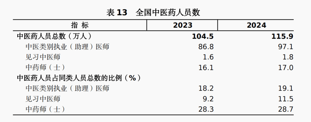 数据格表惊人:2024年,宇宙卫生职员总数增进了3.6% ,可是中医药卫生职员总数增进了10.9% 。